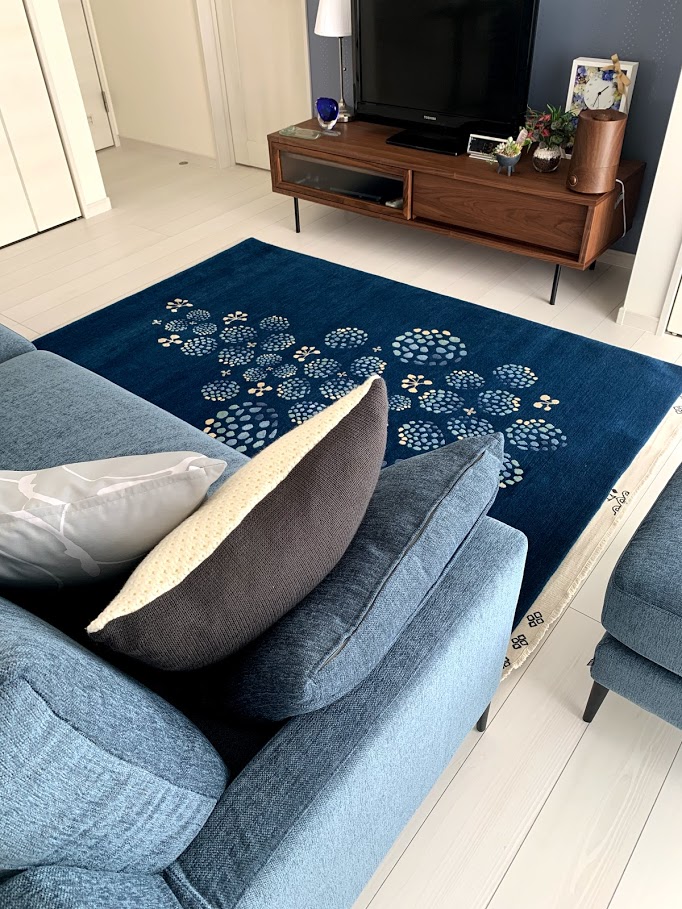 当初グレーのラグでしたがこのブルーのラグがインテリアのポイントになりました。