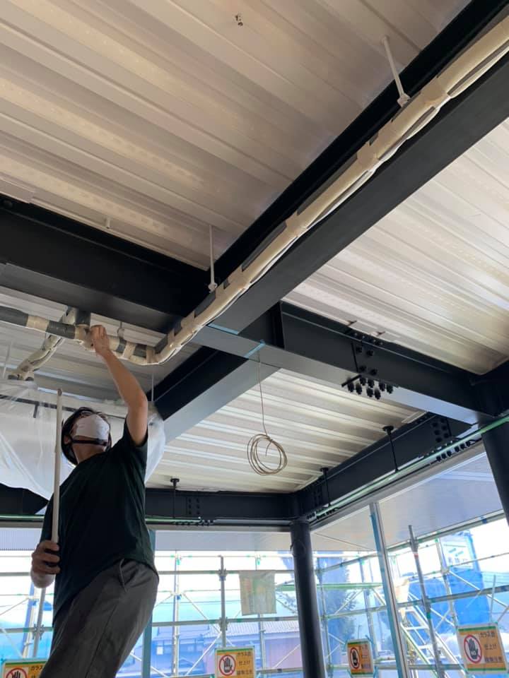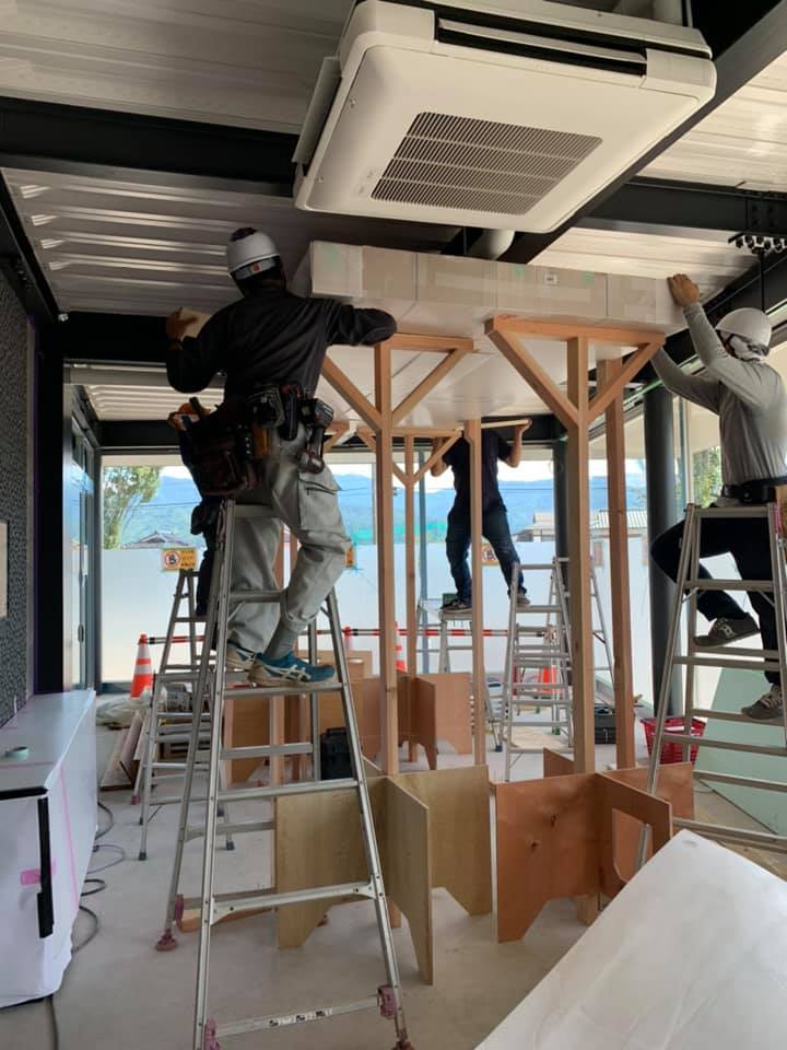 デザインのメインである下り天井は一番の難関。デッキプレート現しの天井にどうつけるか。