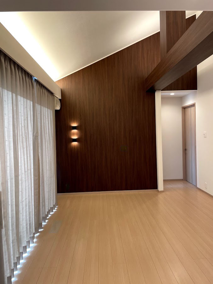 さてその空間です。吹き抜けを間接照明で仕上げました。