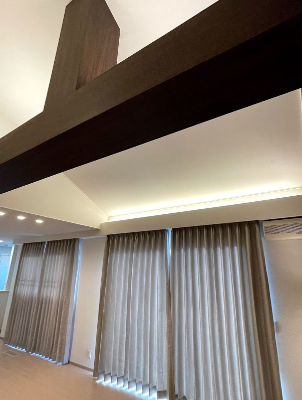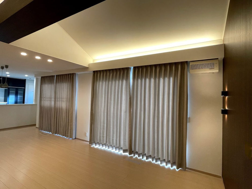 カーテンBOXの上に間接照明、こちらは造作しています。