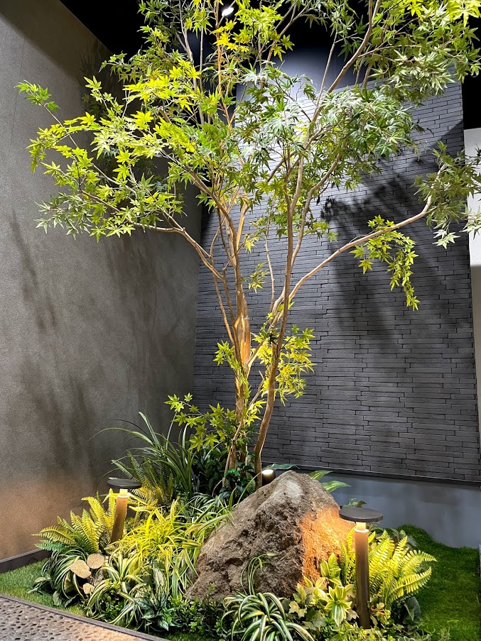 デザイナーさんのの展示デザインに合わせて、本物の木を置いたり、