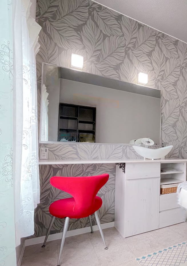 grayのリーフ柄のクロスと赤いチェアがアクセント。