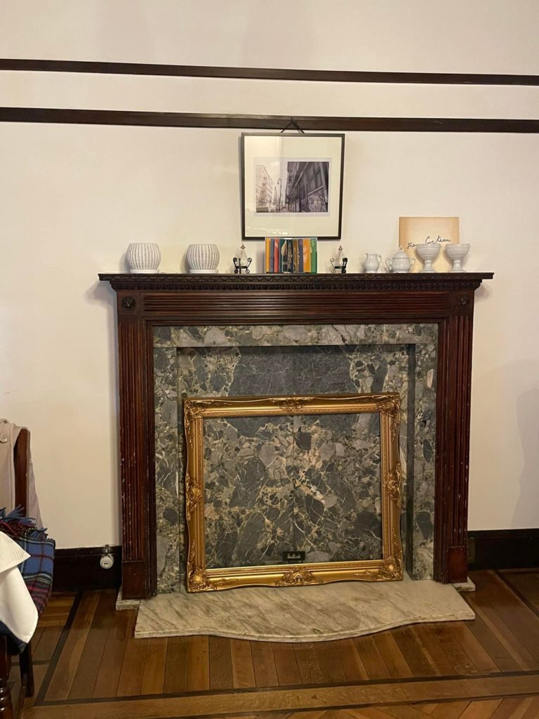 大理石と木彫りの技術が融合された暖炉が空間のアクセント。