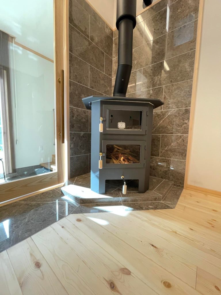大理石の石張りはストーブの色と合わせてグレイ色にしています。