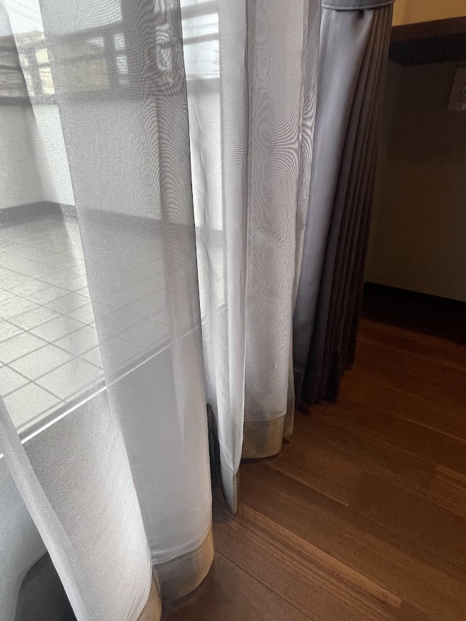 壁紙に合わせてグレーのレースにグレーのドレープカーテン。