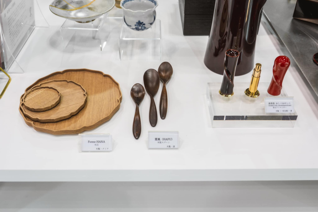展示台のところにはセレクトされた漆のテーブルウエアや漆の仕上げの数々。