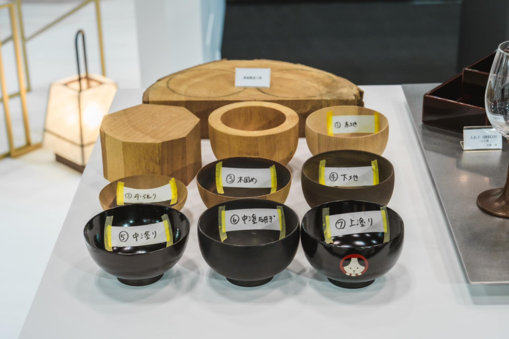 木生地製作、中塗り、漆塗りと丁寧に作られた品物に注目していただきたいという思いをこめて展示。