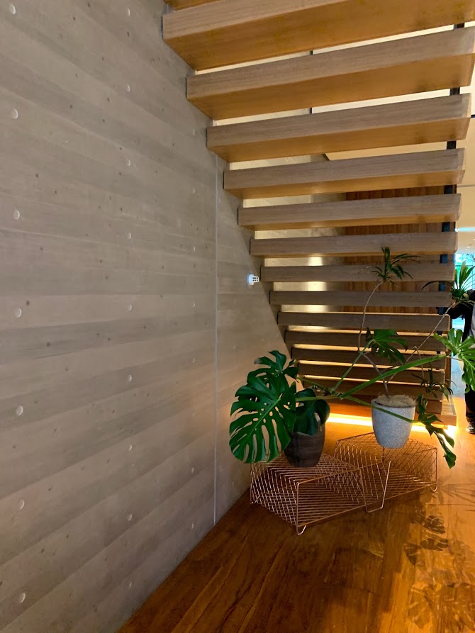 ガラスに映った階段の手すりが美しい