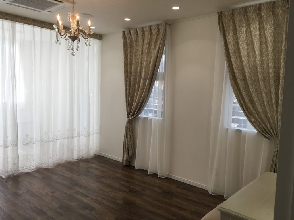 自然光の光が入るようにと、メイクの色を邪魔しないように、ドレープは薄手にしています。