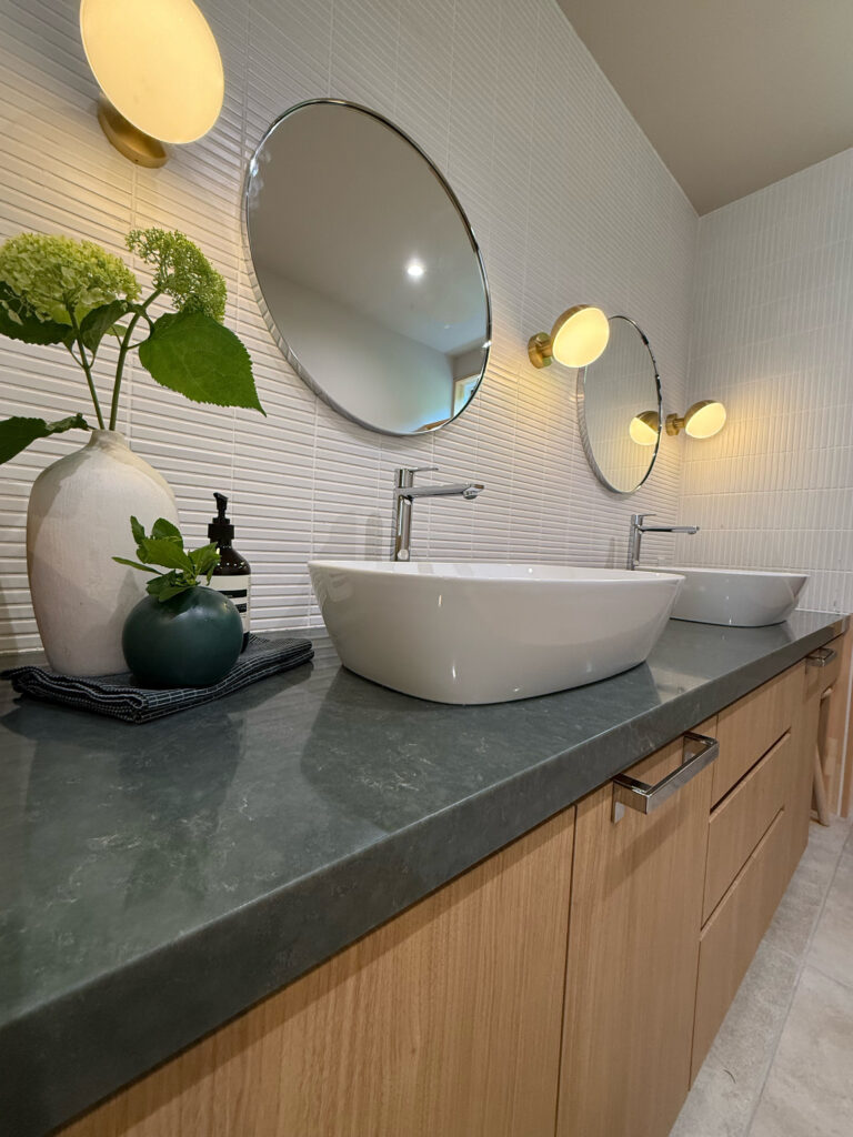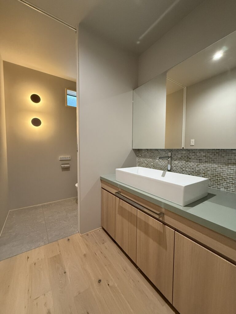 洗面と脱衣室を分け、訪れた人がゆっくり身支度できるように3 か所の手洗い場を設けました。