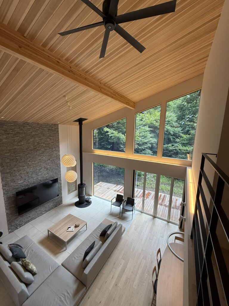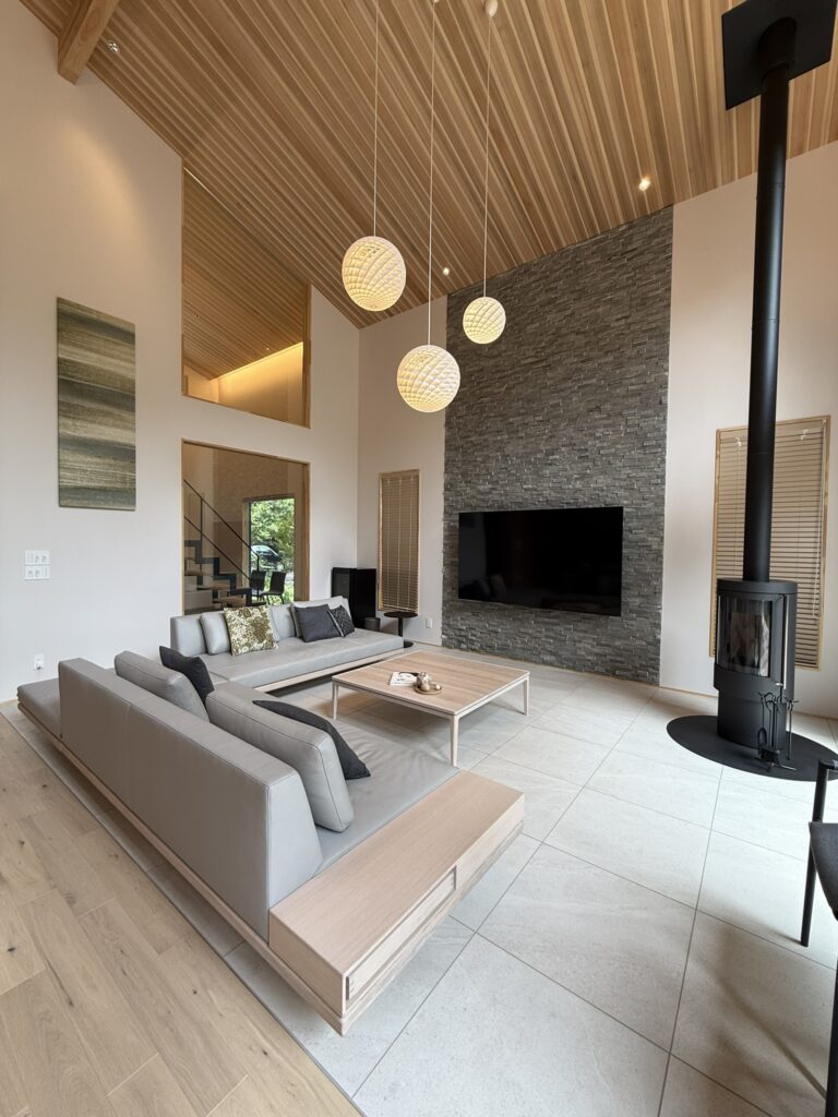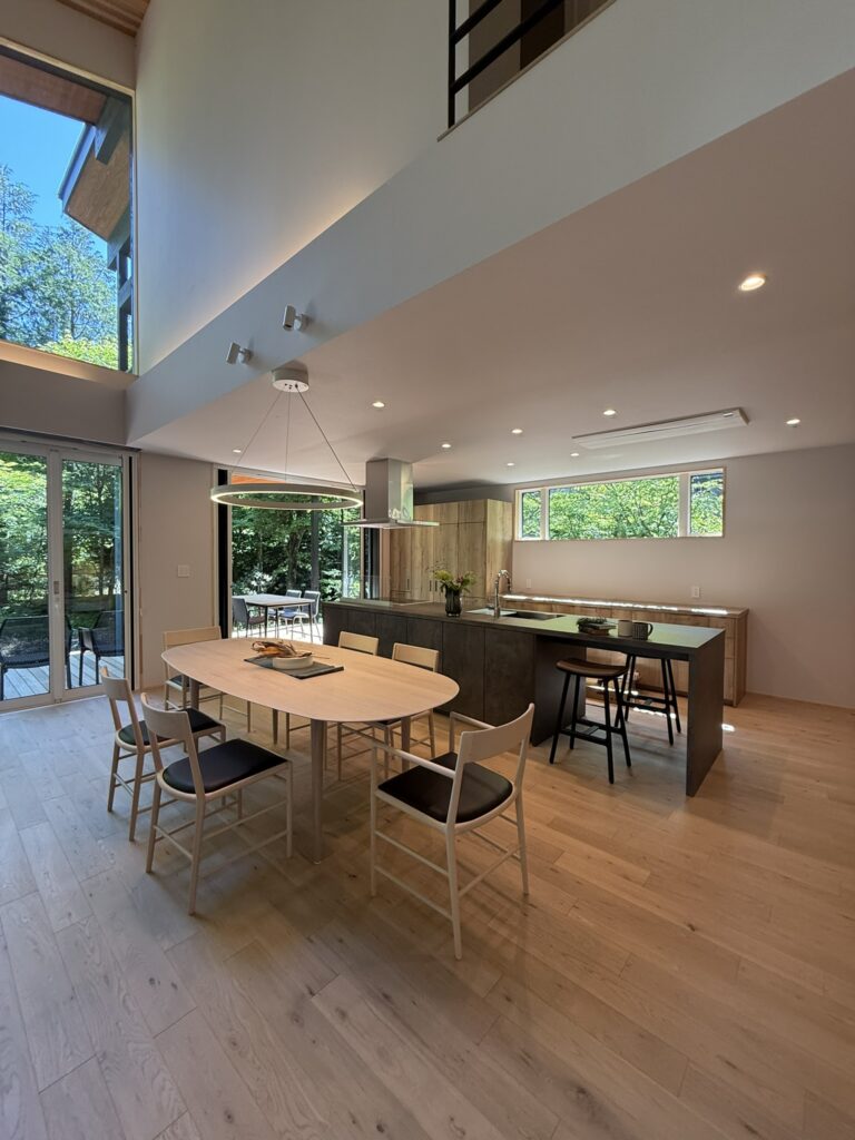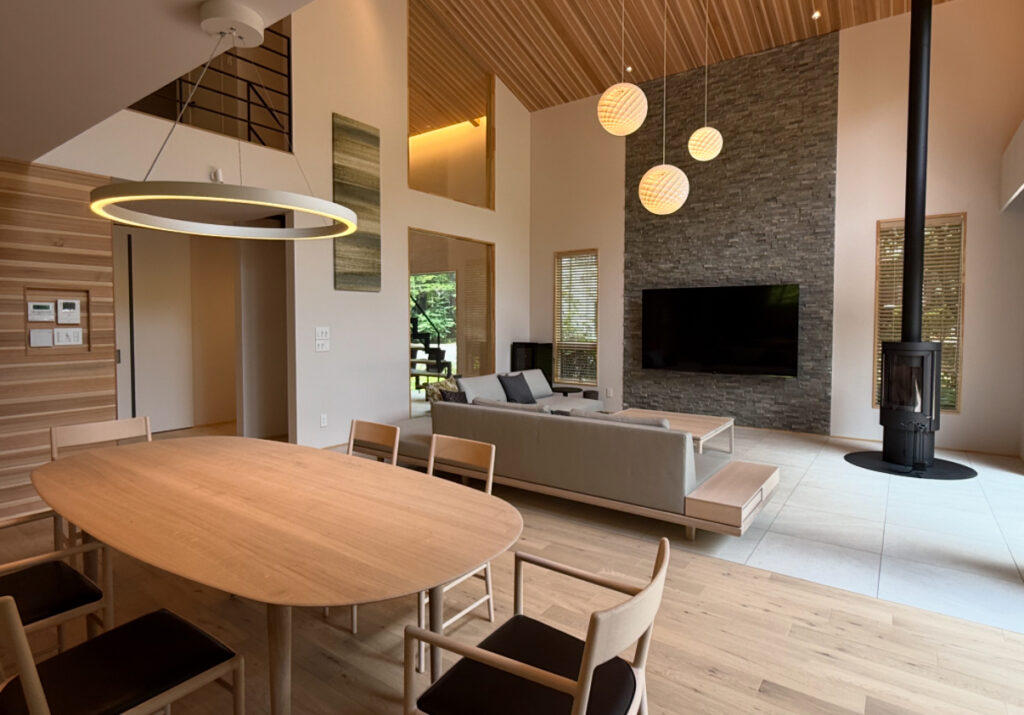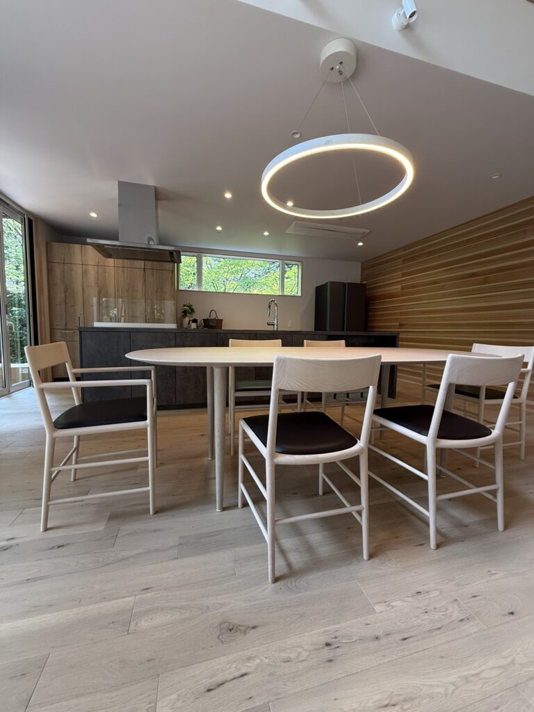 吹き抜けから繋がる無垢材の天井と、オーバルのパテラの柔らかな光が重なり、