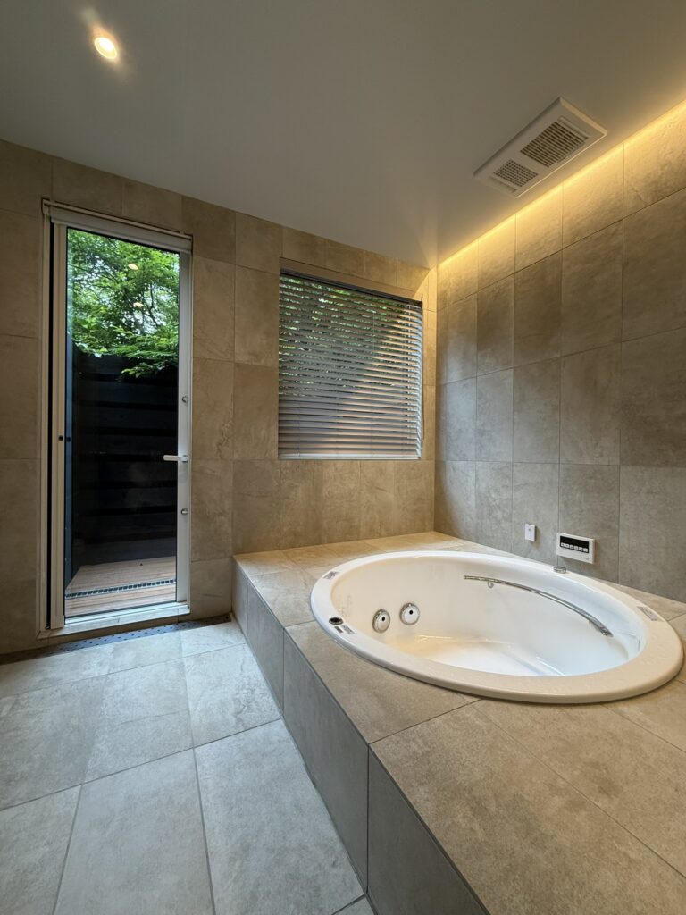 造作で設えたお風呂は照明を灯しても、灯さなくても、